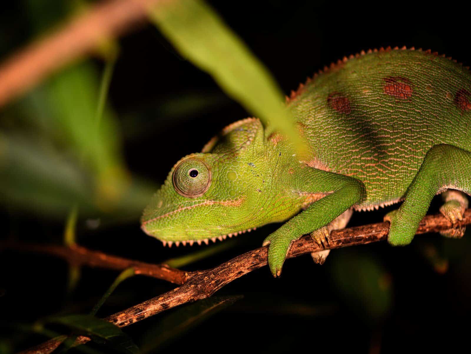 Giant Malagasy, Chameleon is a very large species of chameleon that is endemic to Madagascar, but also has been introduced near Nairobi in Kenya . It occurs in a wide range of habitats, even among degraded vegetation within villages, but is relatively rare in primary forest. With a maximum length of 68.5 cm , it is often considered the largest species of chameleon, though some suggest that prize goes to ”Calumma parsonii”. The diet of this chameleon includes, but is not limited to, invertebrates such as large insects. Prey is acquired with a long, muscular tongue.